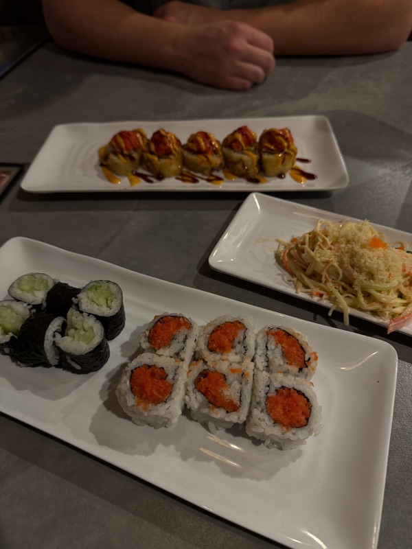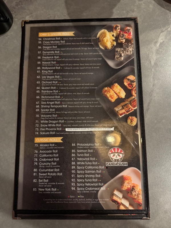 Sushi Panda just recently celebrated their grand opening in August of 2025. They redesigned an old Pizza Hut and transformed the interior into a beautiful Japanese-inspired oasis. They are serving up Japanese cuisine like no other! The atmosphere inside is warm and inviting. The beautiful woven light fixtures, and wood finishes really give it that comforting feel. Up towards the front of the dining room, you can see the sushi chefs hard at work, making perfectly crafted, tasty rolls at lightning speed. Their high-quality fish and vegetable ingredients are always on display to show customers just how fresh their food is going to be.