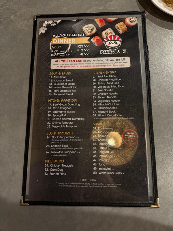 When visiting Panda Sushi, you can expect to find different pricing depending on what time of the day that you are dining. Their lunch menu, which is Monday- Friday until 3 p.m., offers all-you-can-eat for $16.99 if you are an adult. Children aged seven to eleven can eat lunch for $8.99 and children aged three to six can eat for $5.99! The lunch menu offers soup and salad, appetizers, rice and noodle entrees, and of course sushi. They do not offer hibachi for lunch, but if that doesn’t bother you, definitely dine in for lunch and save a couple of bucks!